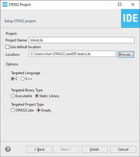 Initially, our aim is to establish a static library. Begin by initiating a new STM32 project, where you’ll designate your target board, assign a project name, and specify the targeted binary type as Static Library with targeted project type as an Empty.